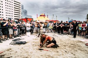 Draw A Squared Circle looks at the world of professional wrestling, an extreme type of physical story telling that mixes soap opera storylines with choreographed stage fighting. Events shown range from small shows in bars and clubs to large-scale productions in arenas. A portion of the project looks at death match wrestling: an ultra-violent form of the sport where wrestlers perform brutal blood laden matches with weapons. These contests feature barbed wire bats, thumbtacks, fluorescent light tubes, and flaming tables.